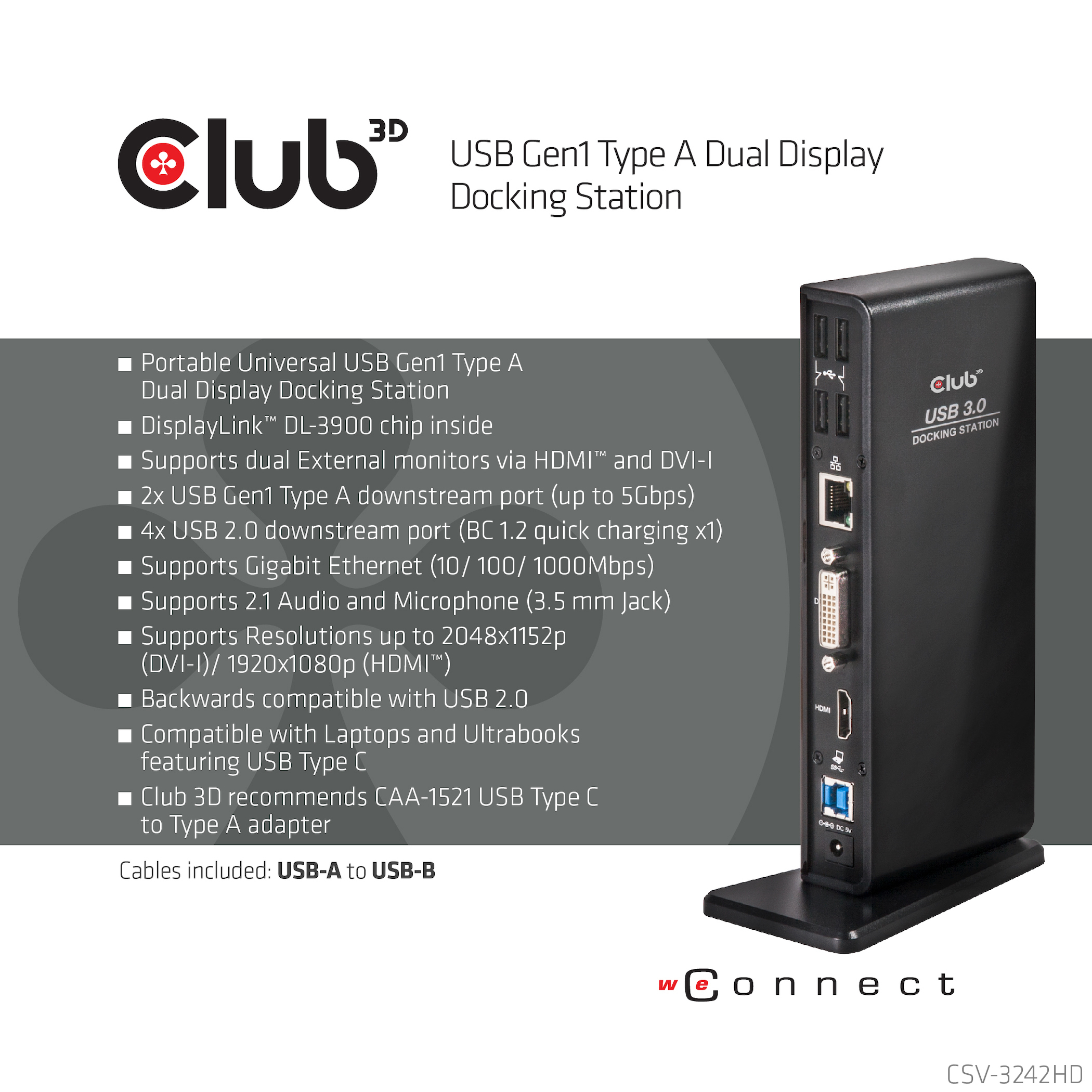 Die Club 3D USB 3.0 Dual Display Docking Station wurde entwickelt für Leute mit hohem Bedarf für zusätzliche Anschlüsse. Mit der Docking Station kannst Du die Anschlüsse deines Computers für mehr USB Peripheriegeräte, Ethernet Netzwerk, Lautsprecher und Mikrofon über nur ein USB Kabel erweitern.