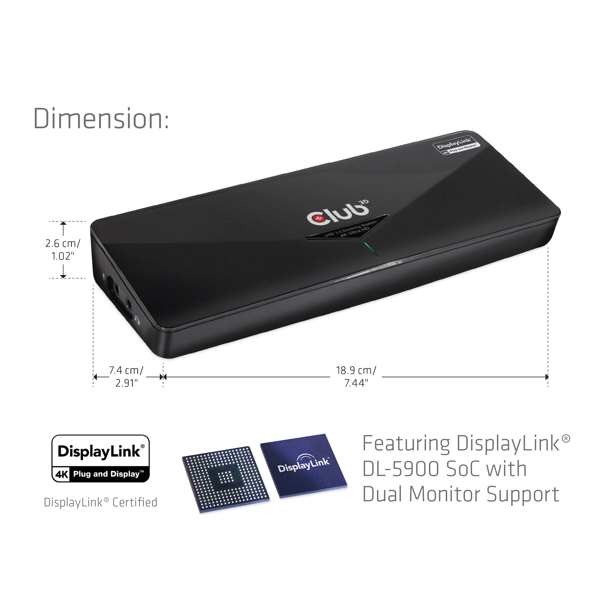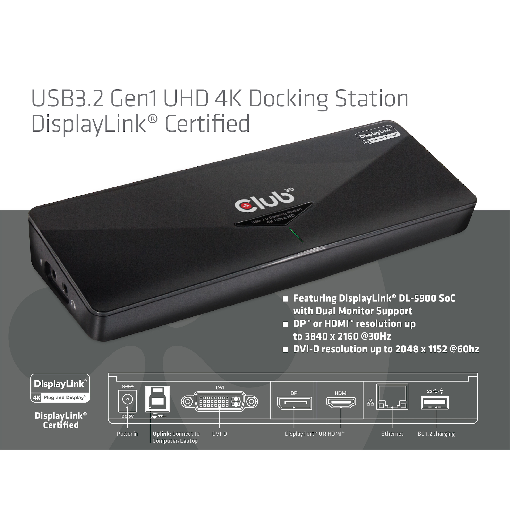 SenseVision USB 3.0 4K Docking StationDie universelle Club 3D USB 3.0 4K Docking Station ist für all Ihre Konnektivitätsanforderungen entwickelt worden. Mit den eingebauten USB 3.0 Ports ermöglicht die Docking Station Ihnen Super Speed Datenübertragung (bis zu 5Gbps) mit Ihren USB Peripherieprodukten zu genießen. Dabei wird auch das Kabelgewirr reduziert und der Datentransfer und die Anschlußmöglichkeiten für Ihr Notebook oder Tablet über nur einen USB 3.0 Uplink Port deutlich verbessert.