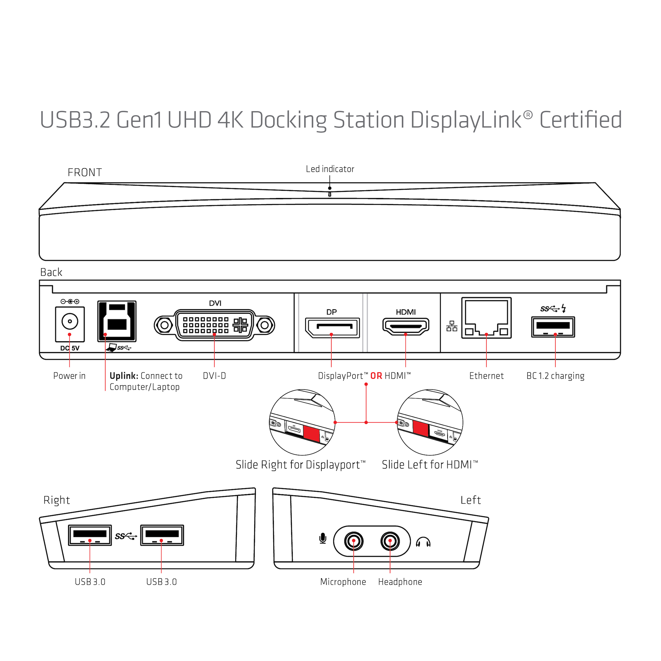 Dual Monitor Unterstützung ermöglicht Ihnen zwischen DP oder HDMI Ausgang plus einem DVI Ausgang zu wählen. Bildschirmauflösungen von bis zu 4K bei 30Hz für ein Single Monitor Setup oder Full HD bei 60Hz für Dual Monitor Setups werden unterstützt. Zusätzlich werden separate Anschlüsse für Ihre Lautsprecher oder Headset und Mikrofon angeboten. Sie können sogar Ihr Smartphone über den BC1.2 Fast Charge Port in nur ein paar Minuten aufladen.