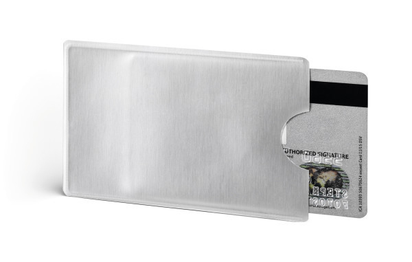 RFID Kreditkartenhülle zum Schutz vor unbefugtem Auslesen der persönlichen Daten. RFID Schutzhülle mit transparenter Vorderseite für 1 Karte im Scheckkartenformat TÜV-geprüfter Schutz auf 13,56 MHz. Mit Daumenstanzung für schnellen Zugriff Innenmaße: 54 x 86 mm Außenmaße: 61 x 90 mm