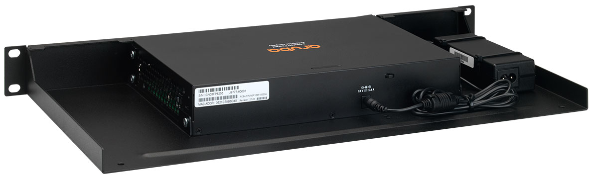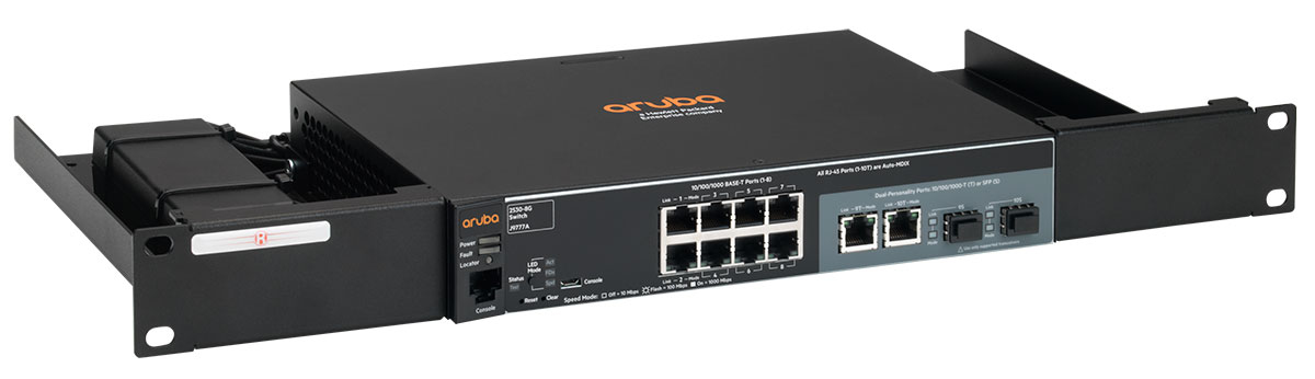 Mit dem RM-HP-T1 können Sie Ihre HPE / Aruba Desktop Gerät auf ein 19-Inch-Gestell montieren. Das Gestell ist speziell auf die aufgelisteten Modelle zugeschnitten, um perfekte Passform zu garantieren. Die Verbindungen befinden sich an der Vorderseite, um den Zugang zu erleichtern, ebenso wie der Konsolenanschluss. Die Stromversorgung ist fixiert, um ungewollte Stromausfälle zu vermeiden.