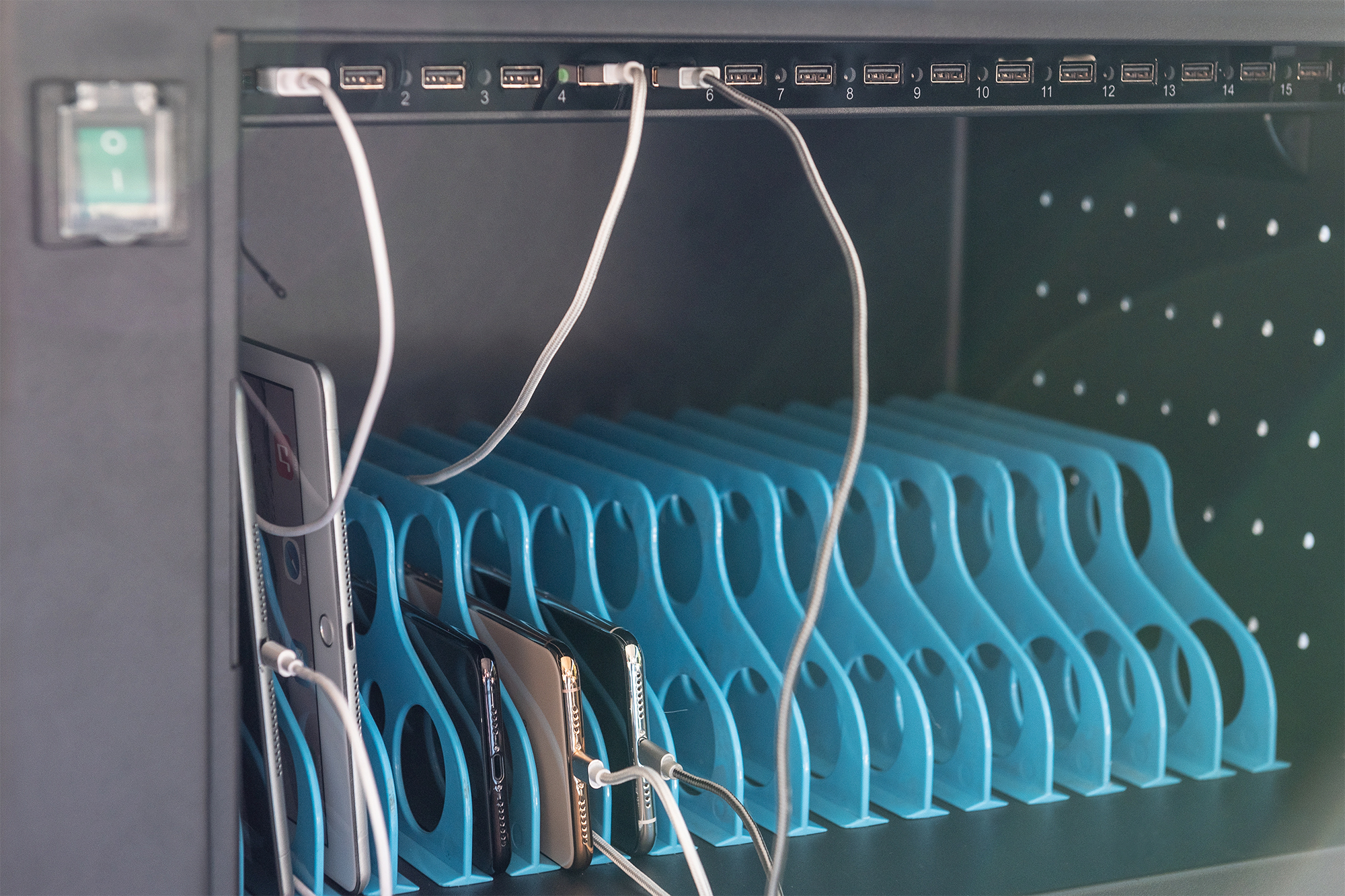 Der mobile Ladeschrank von DIGITUS® ist die ideale und kompakte Lösung zur Aufbewahrung und zum Aufladen Ihrer portablen Geräte, wie z. B. Notebooks und Tablets. Häufig werden mobile Ladeschränke in öffentlichen Einrichtungen wie z. B. Schulen genutzt, um die Geräte an einem zentralen Ort gesichert aufzubewahren und gleichzeitig laden zu können. Der Schrank beinhaltet 16 Ladeplätze, von dem jeder über einen eigenen USB-Anschluss an der Vorderseite verfügt. Ein verbauter Lüfter (24 V) in Verbindung mit Lüftungsschlitzen sorgt für eine aktive Entwärmung des Schrankes.