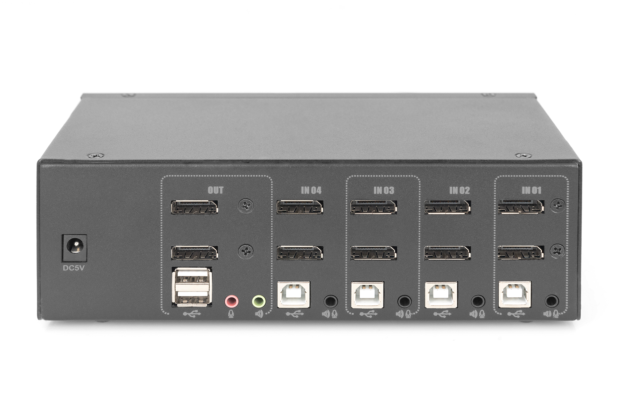 Mit dem DIGITUS® 4-Port KVM-Switch für Dual-Displays haben Sie die Möglichkeit, vier 4K-fähige PCs über eine einzige USB-Tastatur- und Mauskombination zu bedienen. Per Knopfdruck oder Hotkey schalten Sie bequem zwischen den vier PCs um und sparen sich aufwendiges Umstecken sämtlicher Kabel. Die Ausgabe an bis zu zwei Monitore erfolgt über die zwei DisplayPort® Ausgänge an der Rückseite. Audiosignale von Mikrofon und Lautsprecher werden ebenfalls umgeschaltet. Zusätzlich ist ein USB-Anschluss an der Frontseite vorhanden, der für weitere Peripheriegeräte wie z. B. USB-Sticks oder externe Festplatten an beiden PCs genutzt werden kann. Die angeschlossenen Peripherie-Geräte werden jeweils dem aktiven PC zugeordnet. Status-LED an der Frontseite des Switches zeigen Ihnen jederzeit die aktuelle Konfiguration an. Abgerundet wird der Switch durch das robuste Metallgehäuse.