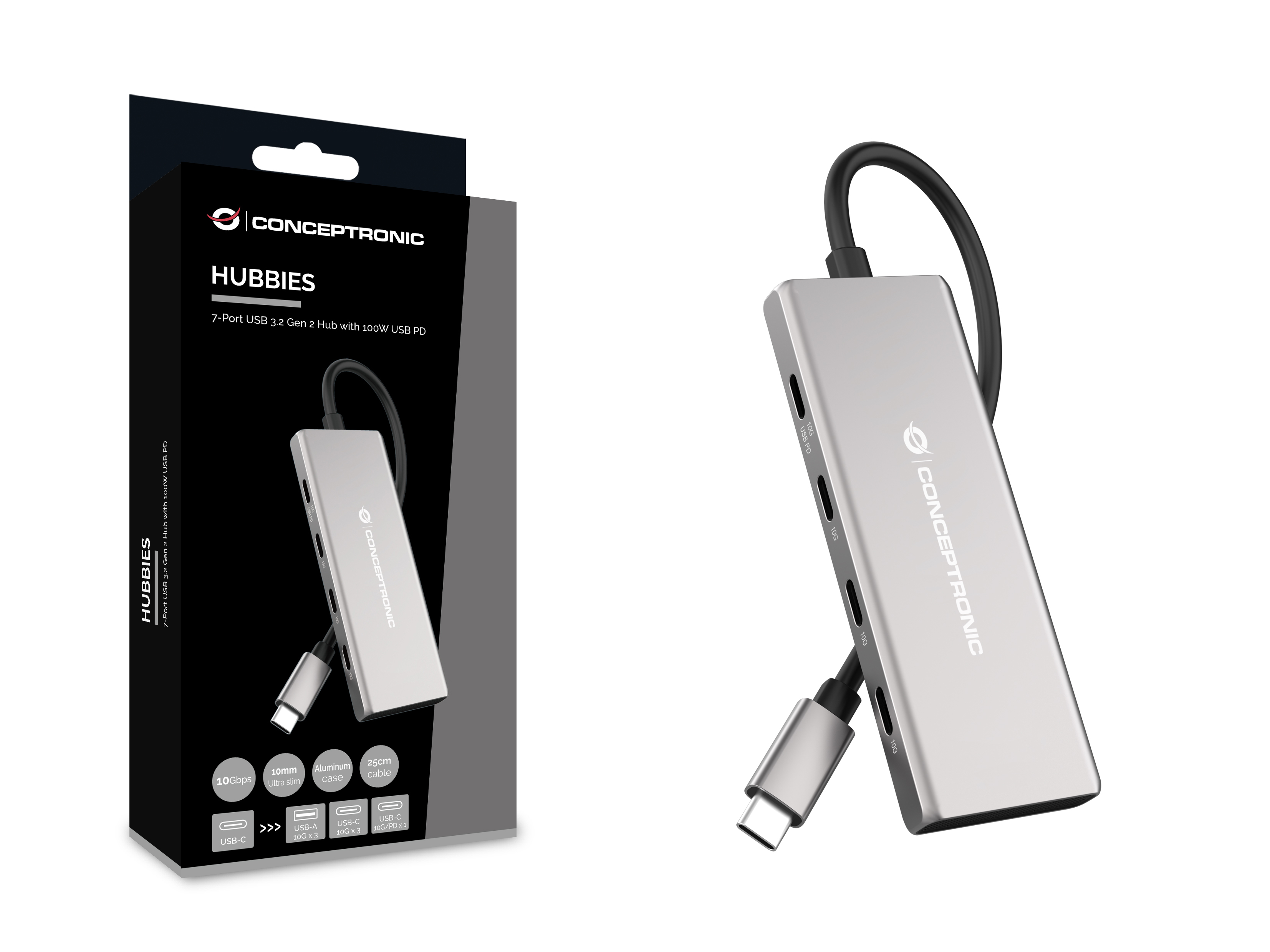 Dieser 7-Port USB 3.2 Gen 2 Hub ermöglicht die Erweiterung der USB-C-Kapazität Ihres Geräts um 7 zusätzliche USB-Ports!HUBBIES17G ermöglicht eine einfache Ergänzung von bis zu 7 USB-kompatiblen Peripheriegeräten oder Gadgets zu Ihrem MacBook, Chromebook Pixel oder ähnlichen Notebooks mit USB-C-Ports. Der Hub bietet Dir einen effizienten Weg für die Datenübertragung mit Übertragungsgeschwindigkeiten von bis zu 10Gb/s. Darüber hinaus verfügt der Hub über eine USB Power Delivery (PD) Funktion von bis zu 100W, was schnellen Datentransfer und effizientes Aufladen in einer praktischen Lösung sicherstellt.