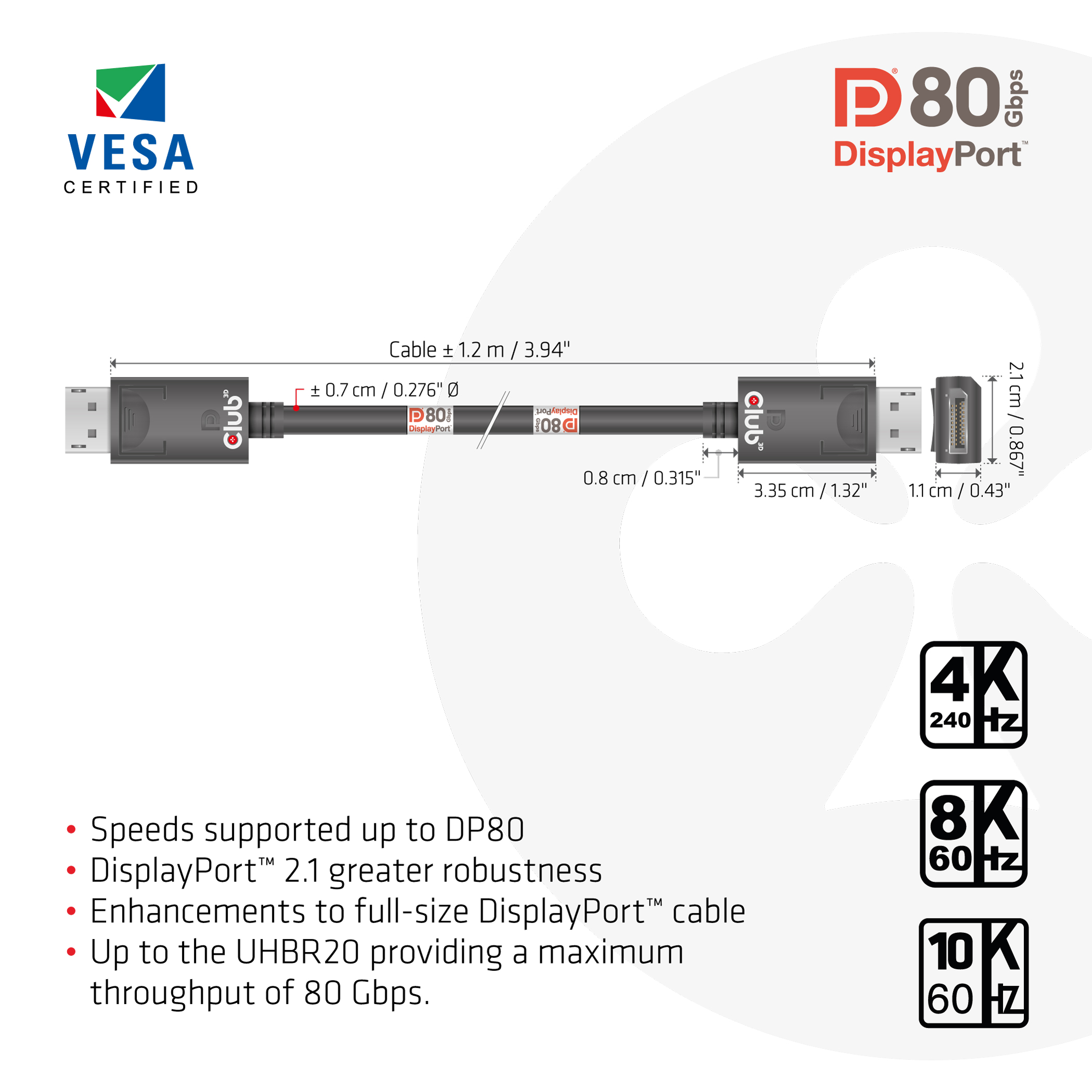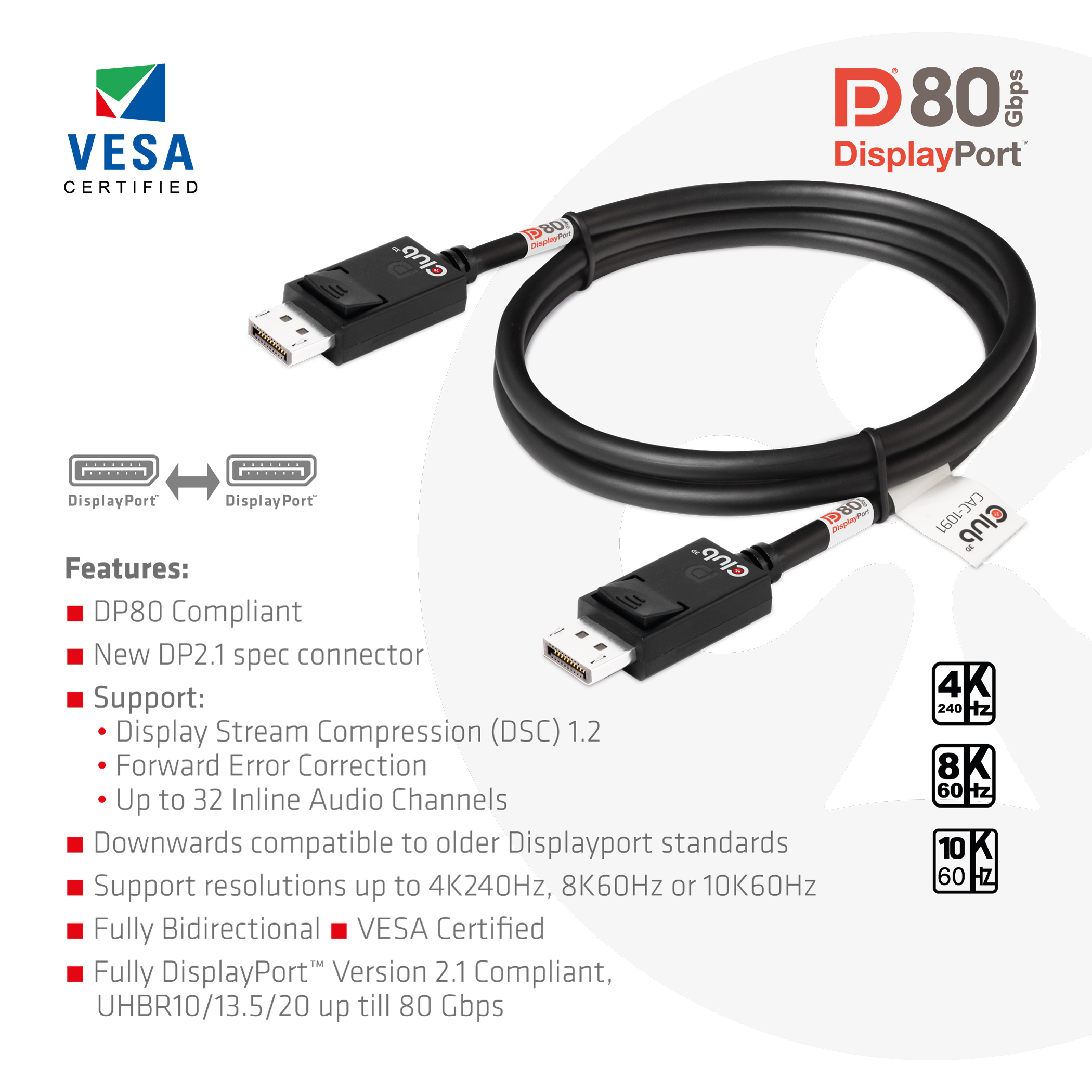 Das Club 3D CAC-1091 DisplayPort 2.1 Kabel ermöglicht die Verbindung Ihres DisplayPort-unterstützten (Gaming-) PCs oder Laptops mit einem (Ultra-) High Resolution Monitor oder einem anderen DisplayPort-unterstützten Gerät. DisplayPort 2.1 UHBR10/13.5/20 mit einem effektiven Durchsatz von bis zu 80 Gbit/sbietet außerdem Unterstützung für Display Stream Compression 1.2 (DSC), Forward Error Correction und erweitert die maximale Anzahl der Inline-Audiokanäle