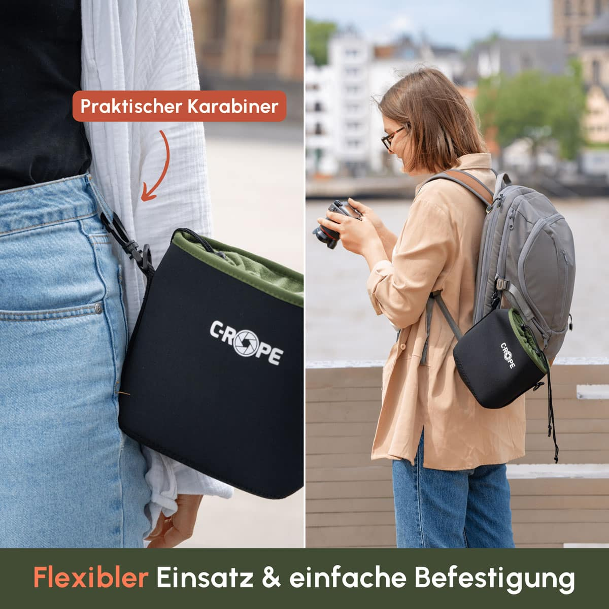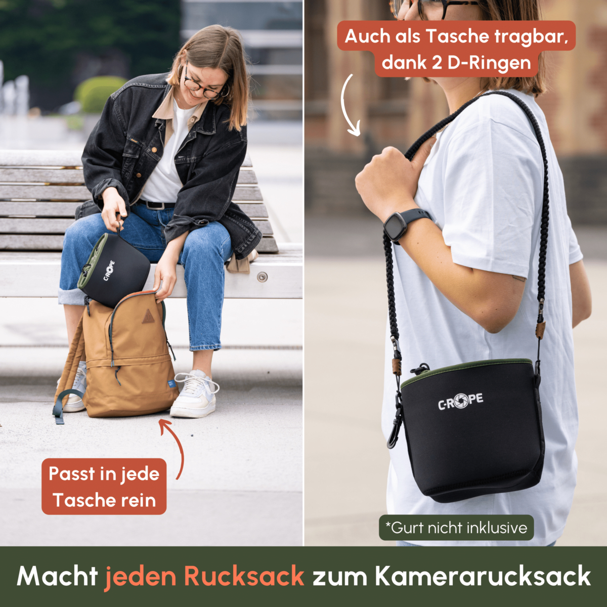 So wird jeder Rucksack zum KamerarucksackDu hast keine Lust, immer den Kamerarucksack einzupacken, möchtest Deine Kamera aber trotzdem sicher transportieren? Dann lege sie in den Kamerabeutel aus Neopren und verwandle jeden Rucksack in einen Kamerarucksack (auch geeignet für Taschen aller Art). So ist Deine Kamera in jeder Situation ideal geschützt.